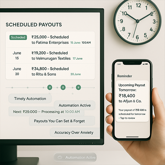 Scheduled payouts automate fund transfers, ensuring timely payments and streamlined financial management for your business operations.